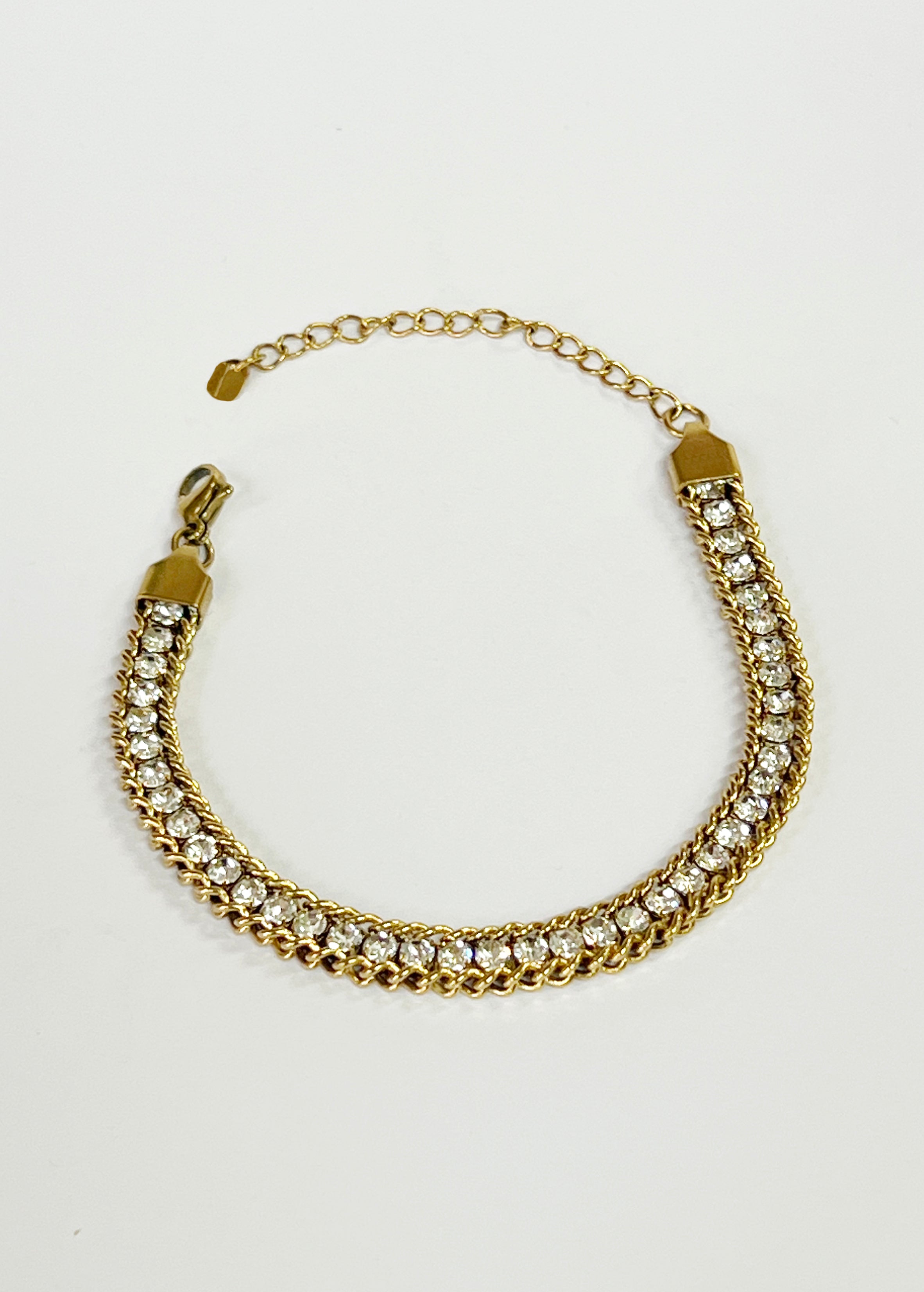 A tennis bracelet of square cut crystals and rope twist chain make for a glamorous timeless piece made in stainless steel and plated in gold vermiel.
