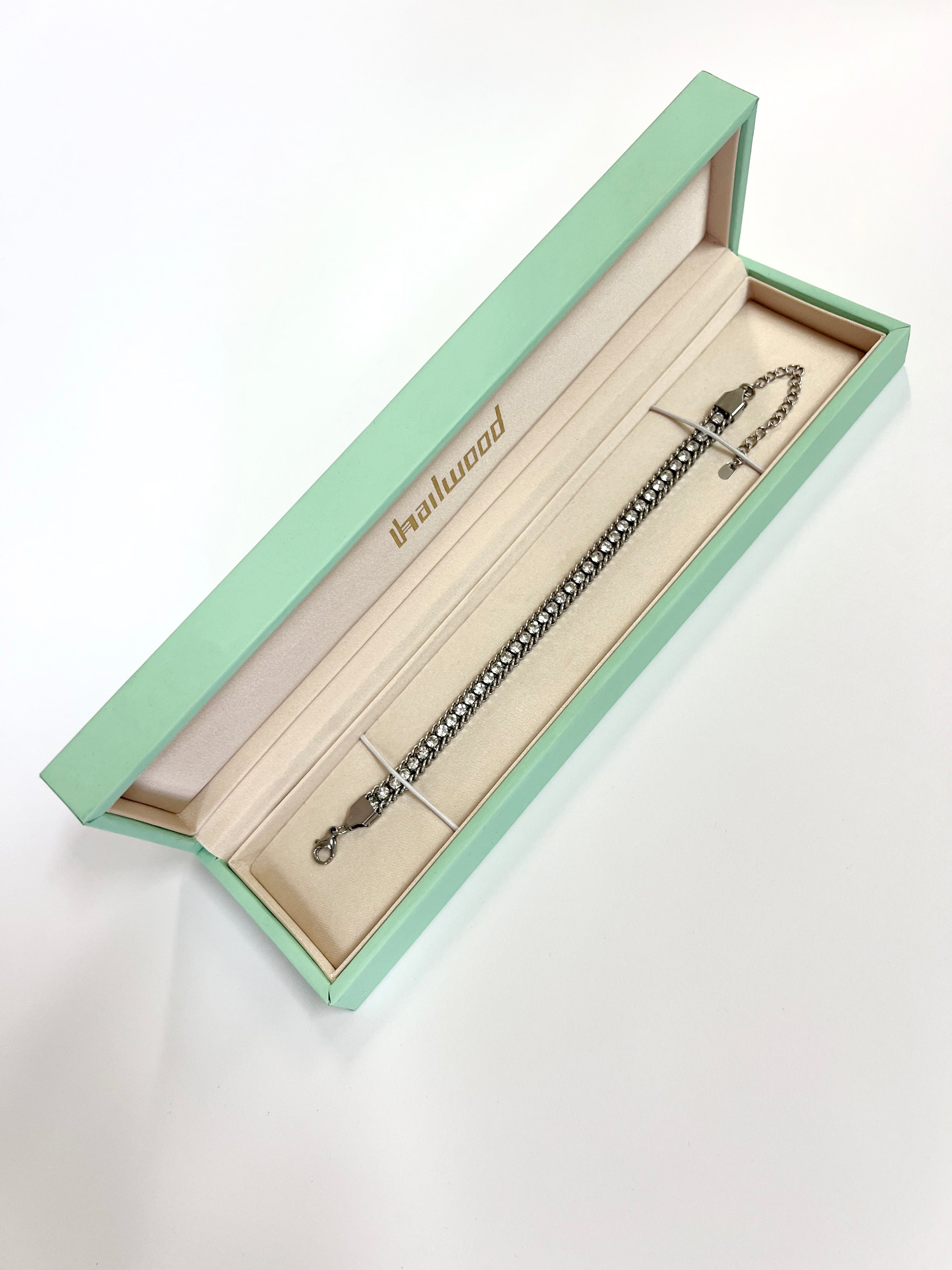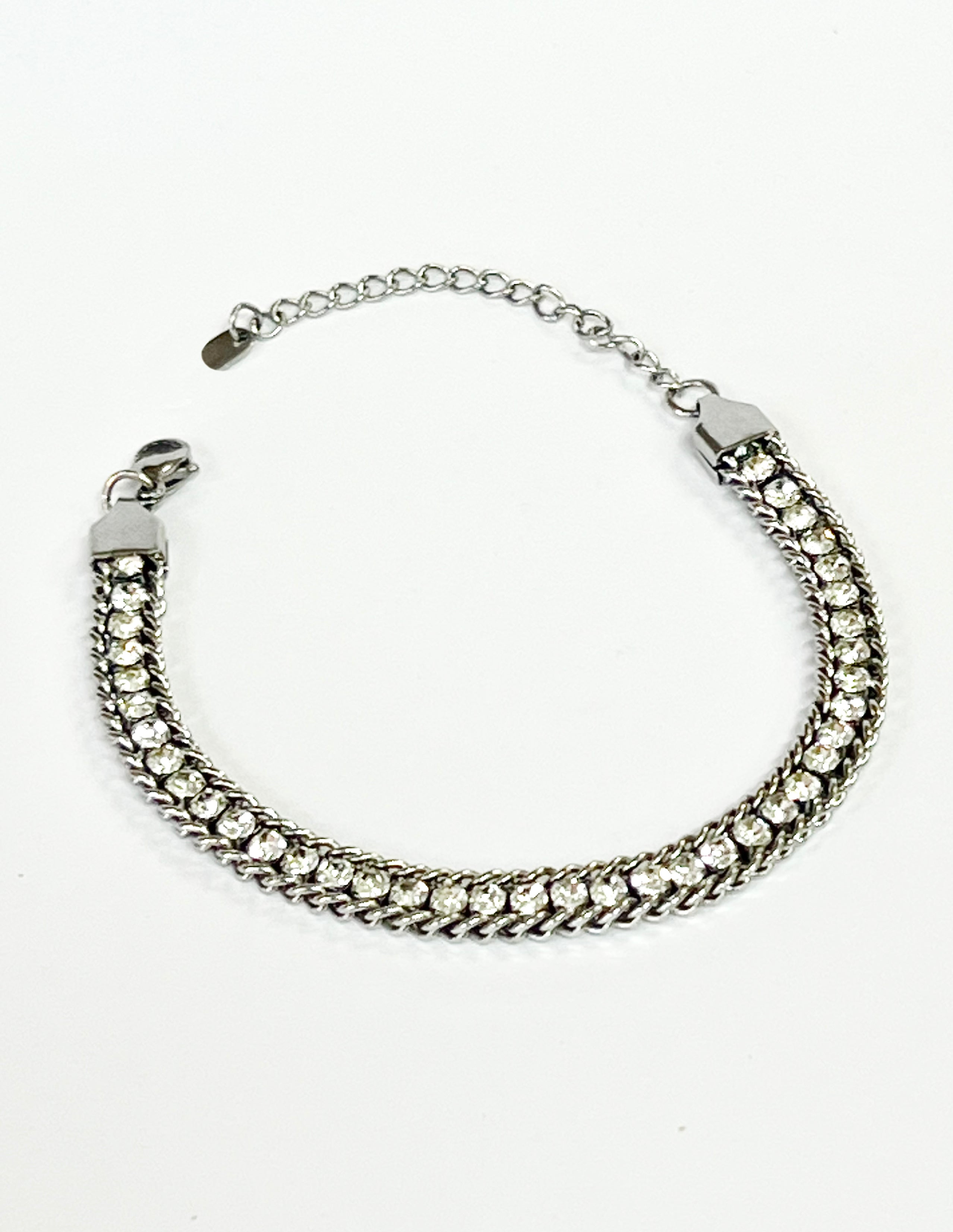 This elegant tennis bracelet with a twist link chain and crystals is made of stainless steal and plated in silver.