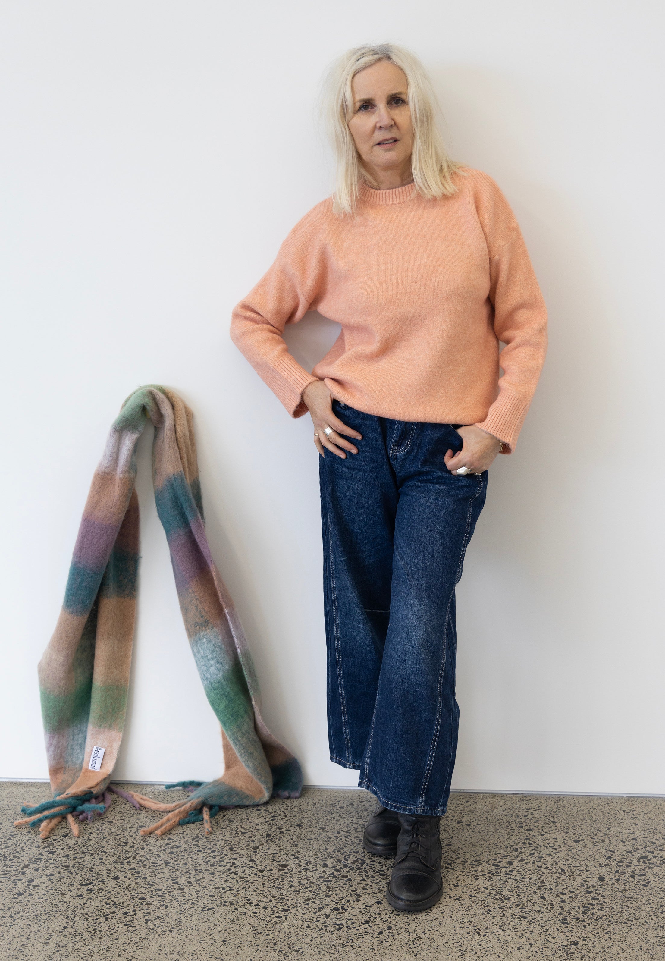 100% lambs wool in a bright peach warms the face with colour and cozy warmth, team with denim for a great winter look.
