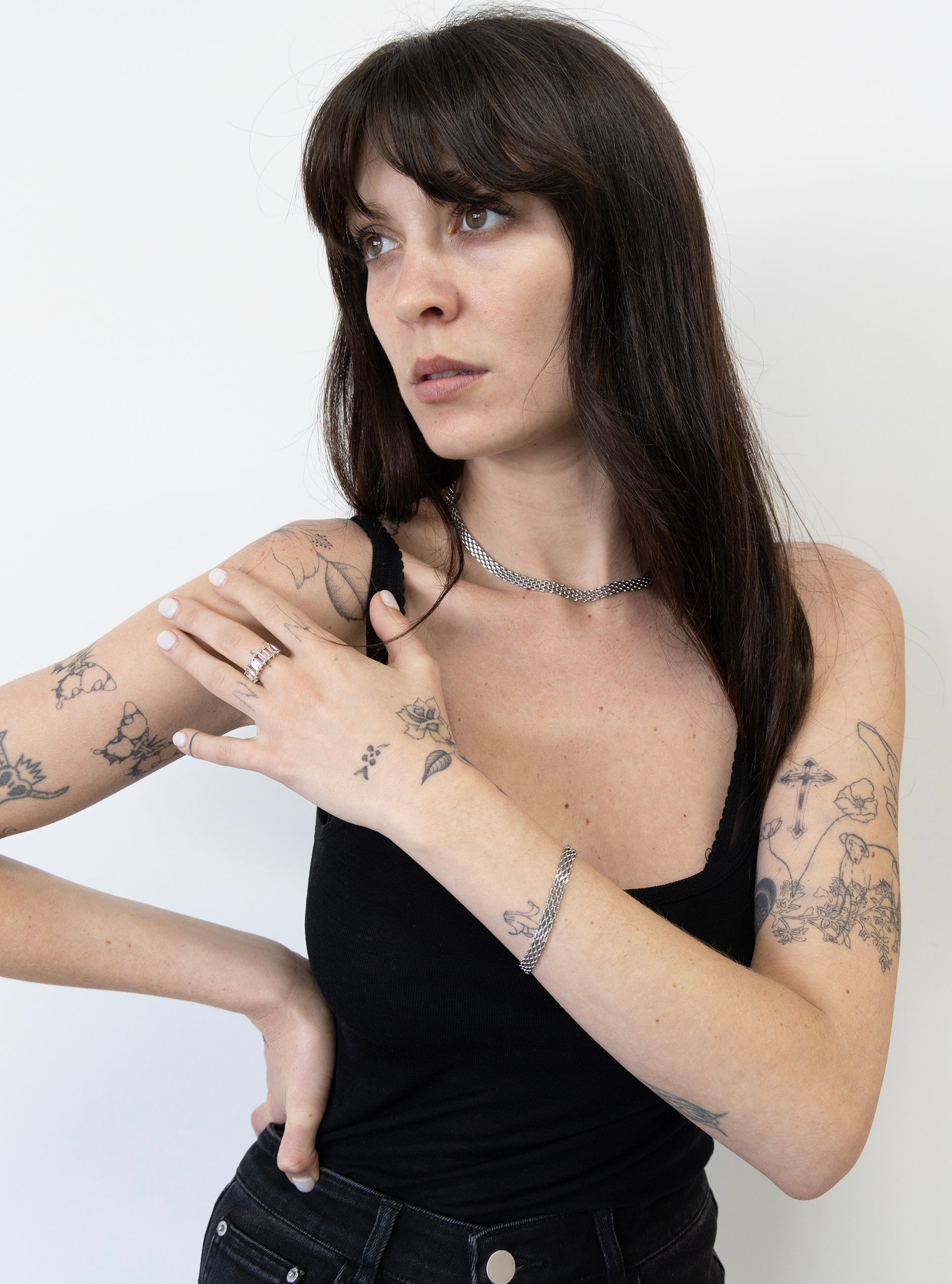 This elegant liquid basket link chain necklace is made of Stainless steal and Sterling silver plate. Also has a matching bracelet.