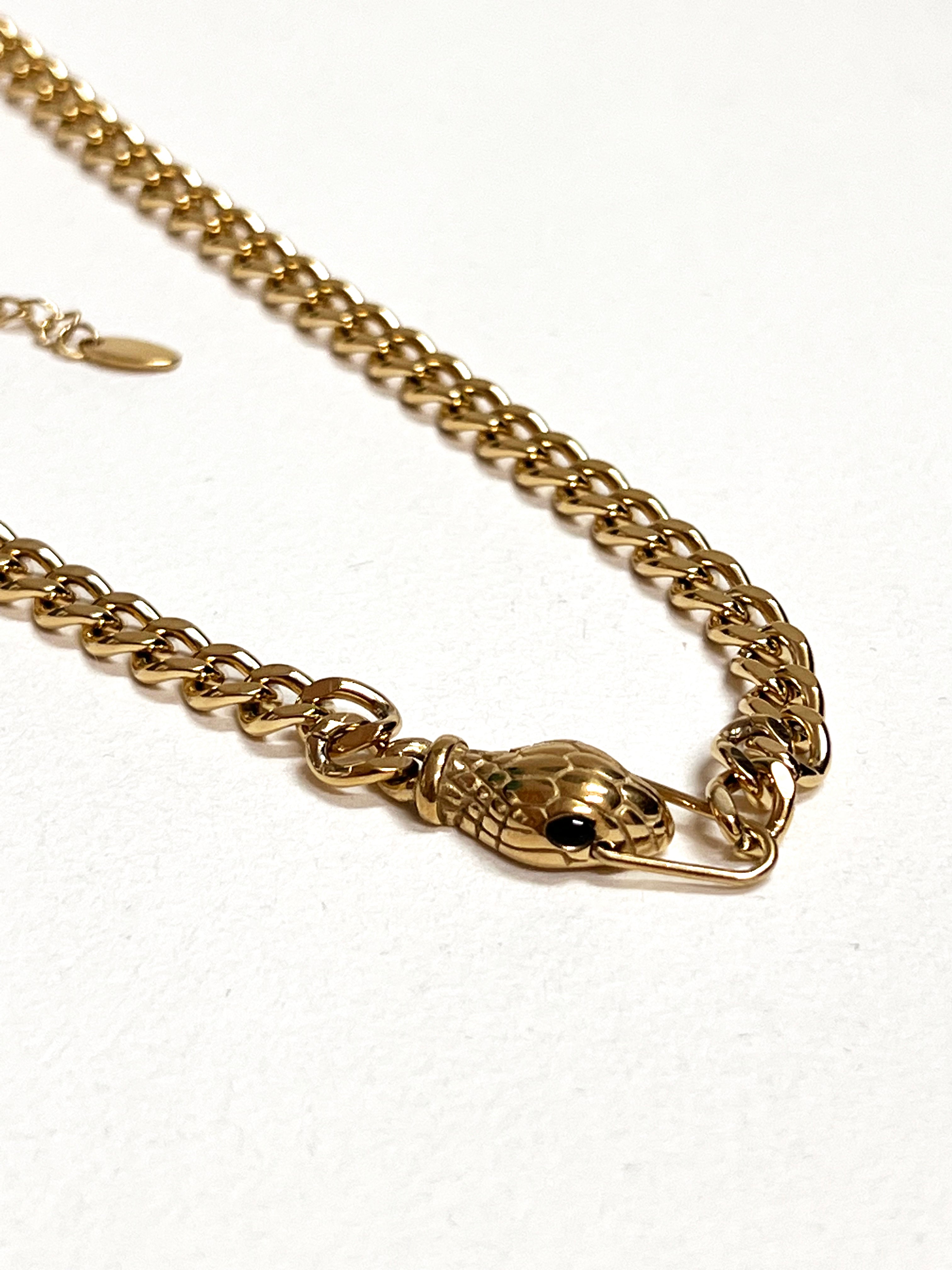 This fine detailed serpant head necklace with black onyx cubic zirconia eyes looks great with a white tee for a casual look or over a black dress for something more dramatic.
