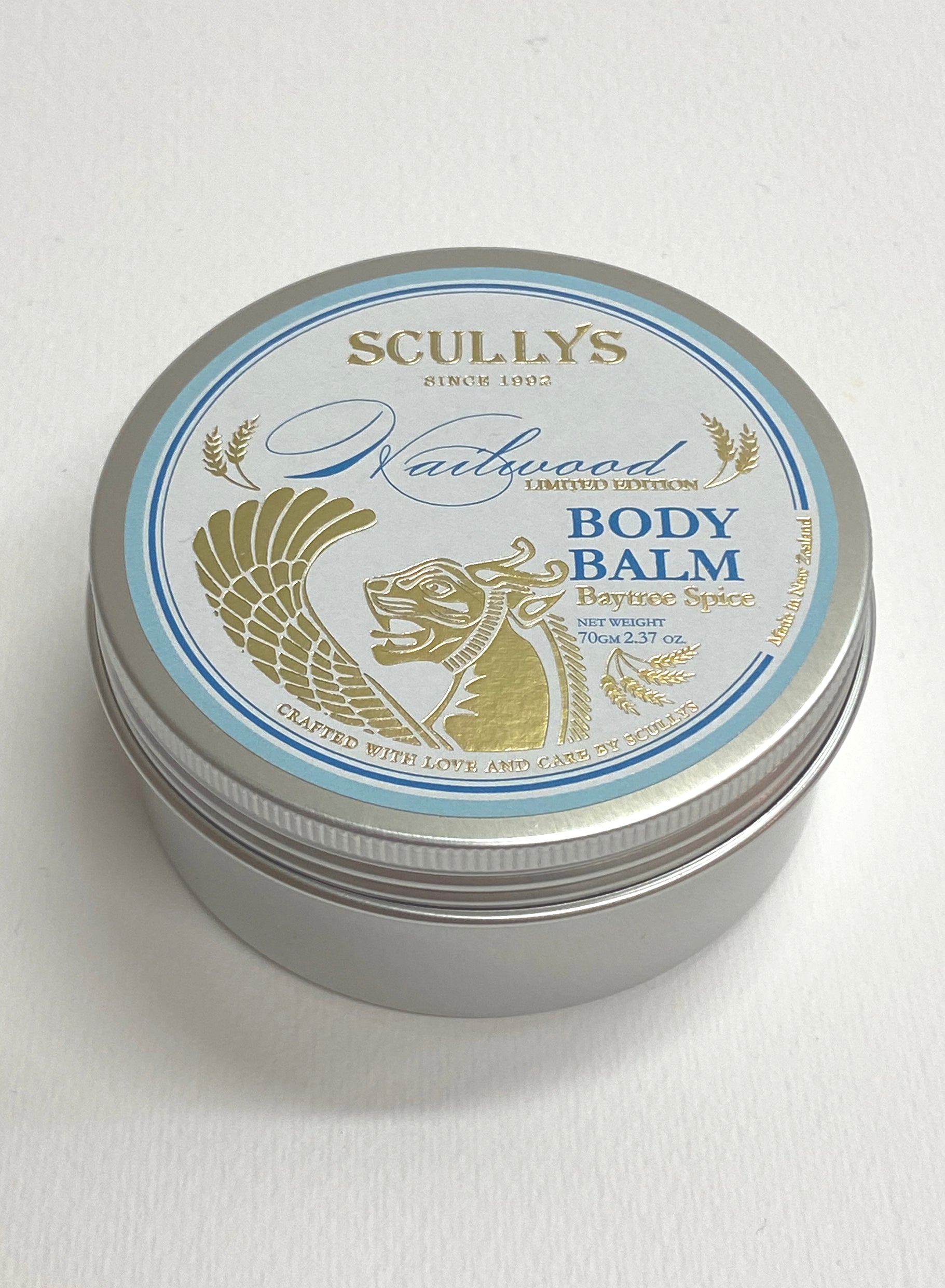 Delicious warm spices blended with natural oils, shea butter, apricot oil, almond oil, and beeswax extracts create a natural body balm to help nourish and repair dry or damaged skin. Designed and packaged by Adrian Hailwood.