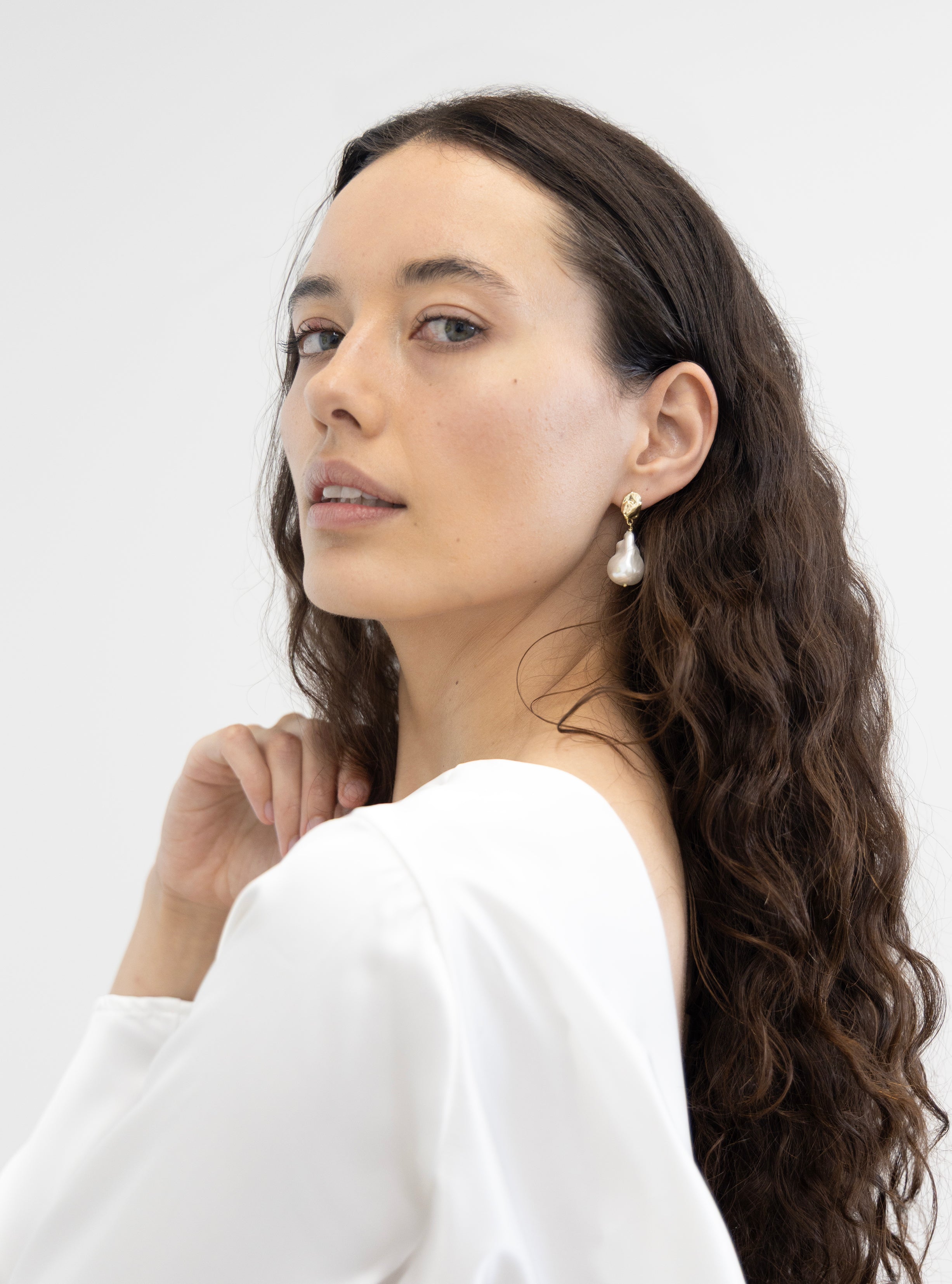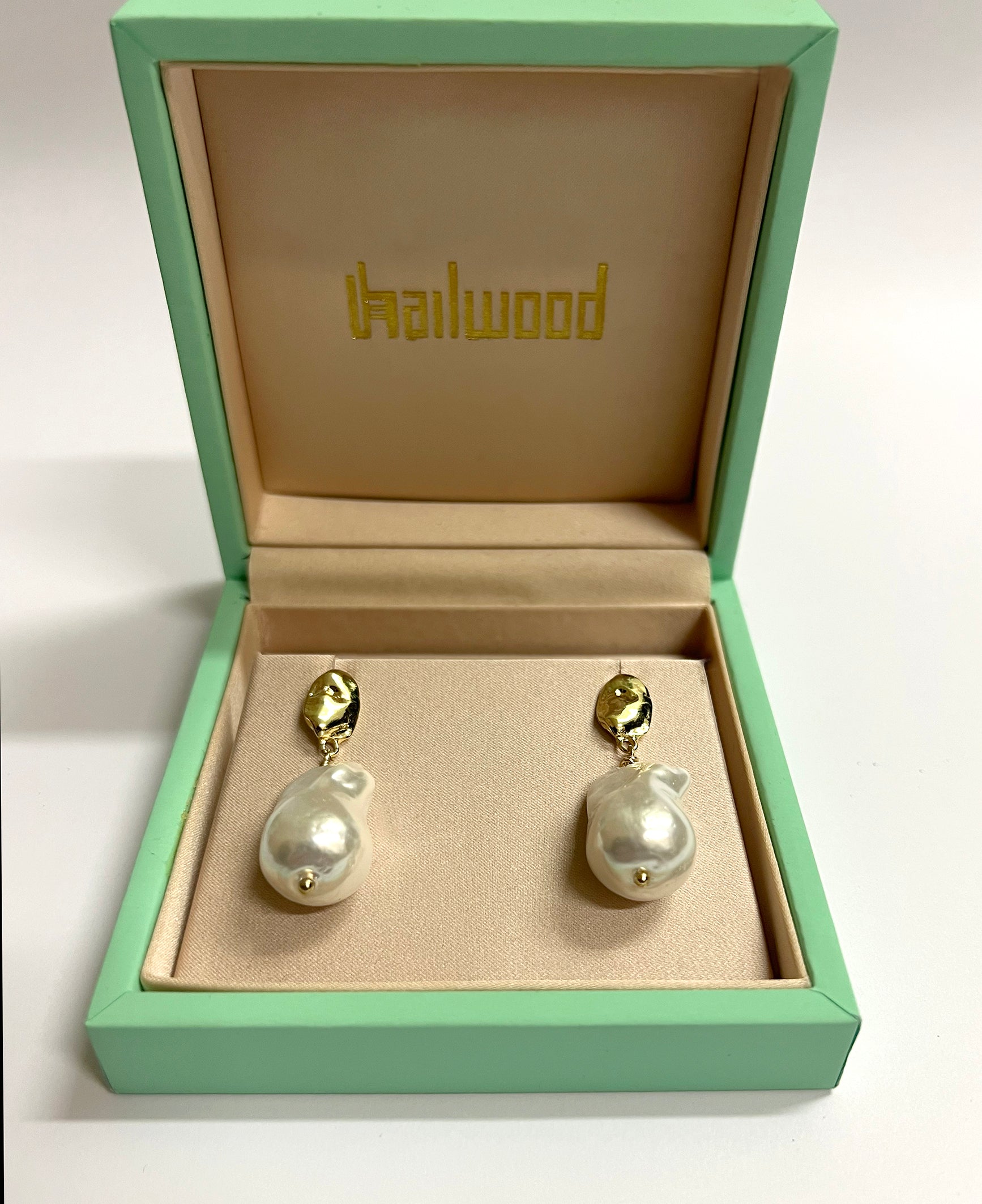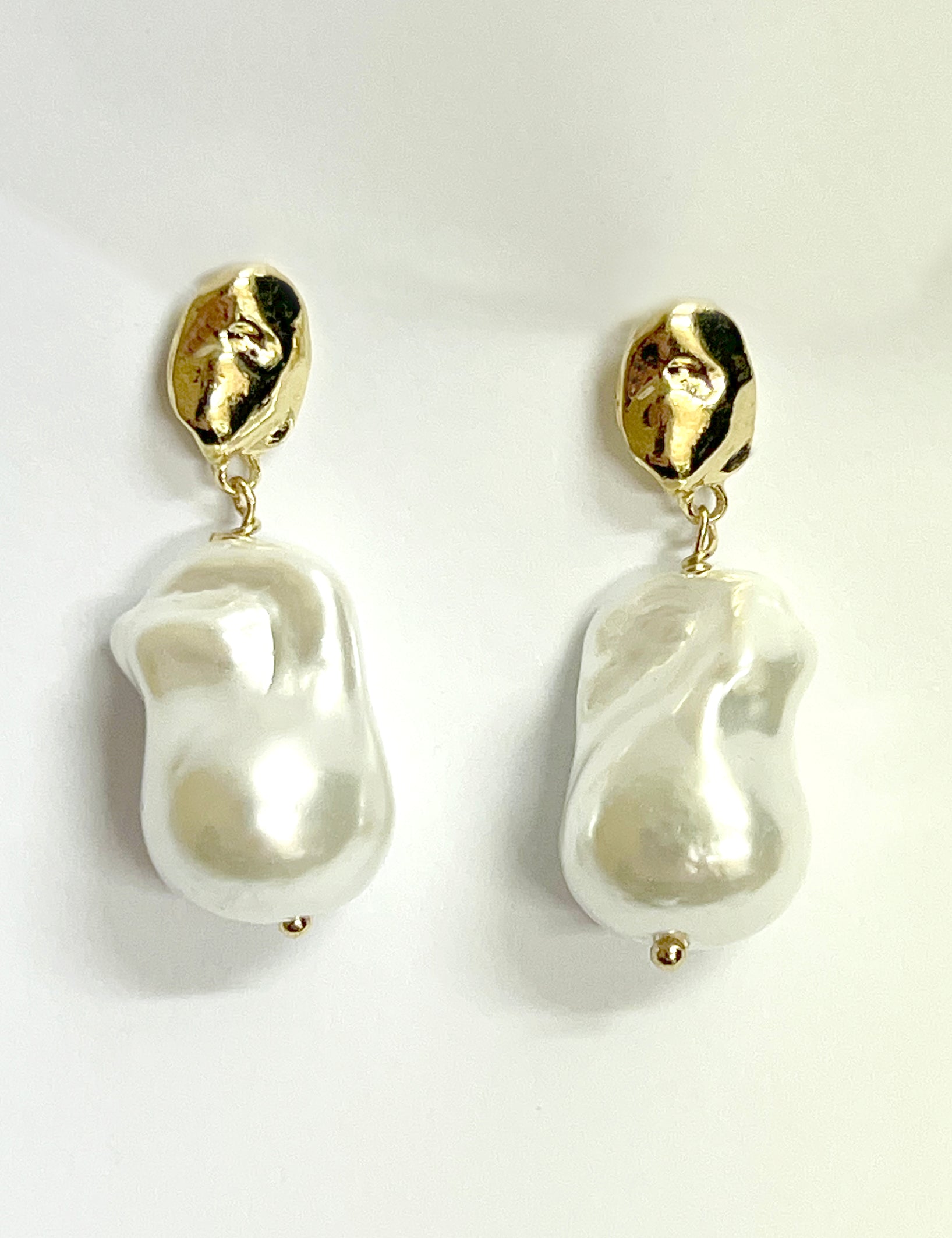 Over sized baroque shape pearl drops, each pearl unique with an oyster colour finish matched with a hint of gold plate. A modern classic for work and evening.
