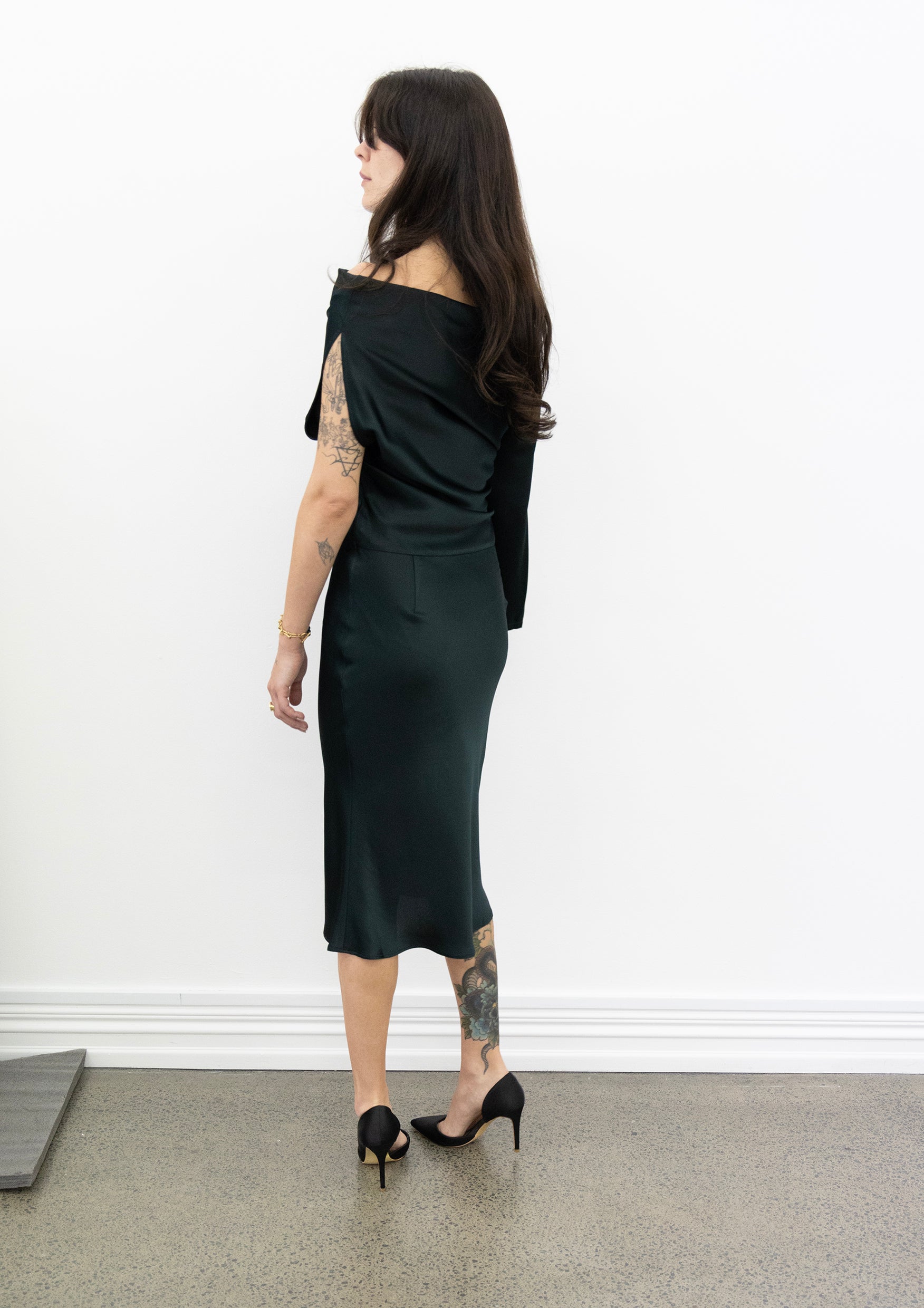A bias cut satin dress in the darkest green satin a modern shape that hugs and drapes the body perfect for black tie.