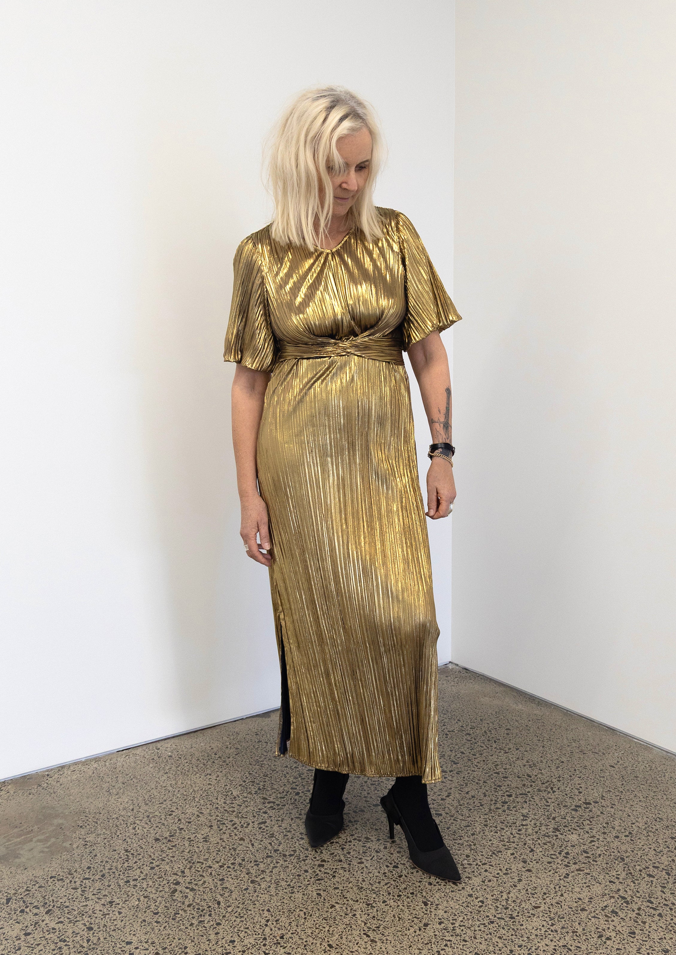 Hailwood’s iconic Galaxy Dress gets a glam upgrade in metallic gold. Featuring a flattering V-neck and stretch pleating that loves all body shapes, it’s the perfect statement piece for parties, special events, or any occasion Model: The Iconic Karyn Hay