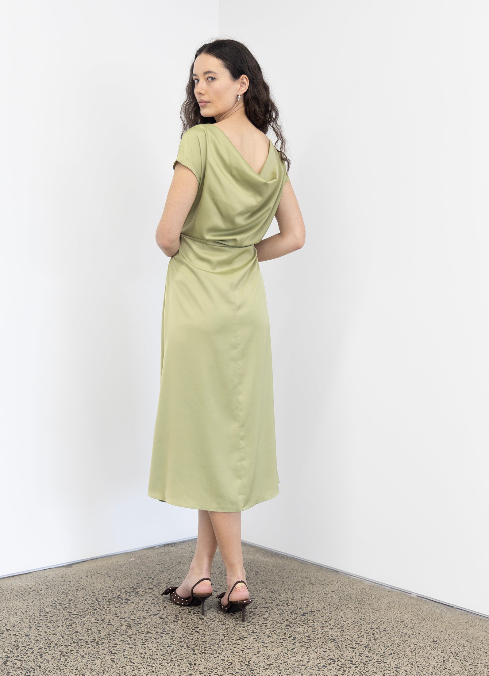 This satin dress in chartreuse is drapped on the bias giving it a 20's look with a modern twist. Perfect for cocktail and evening partys this summer. Also availble in French Navy.