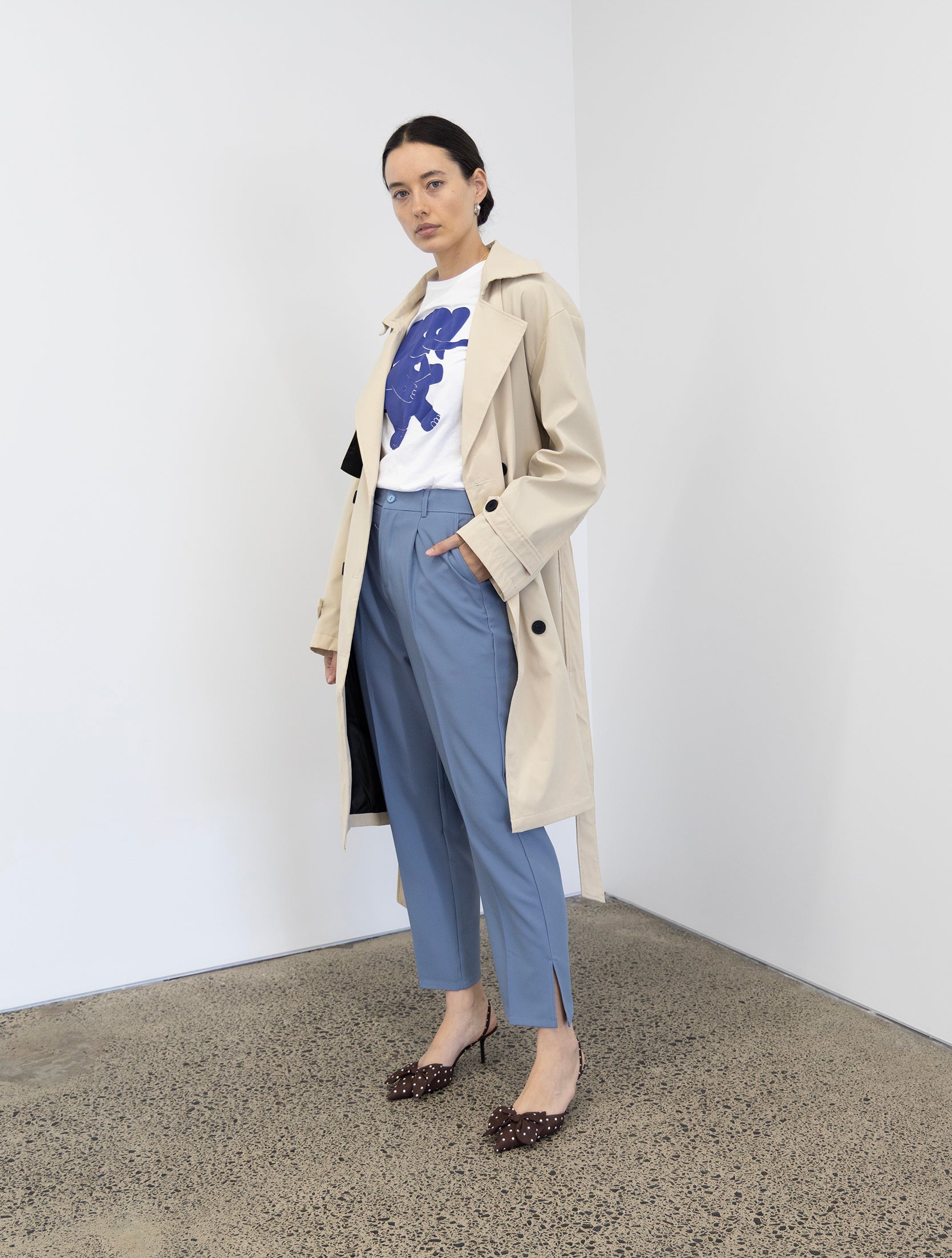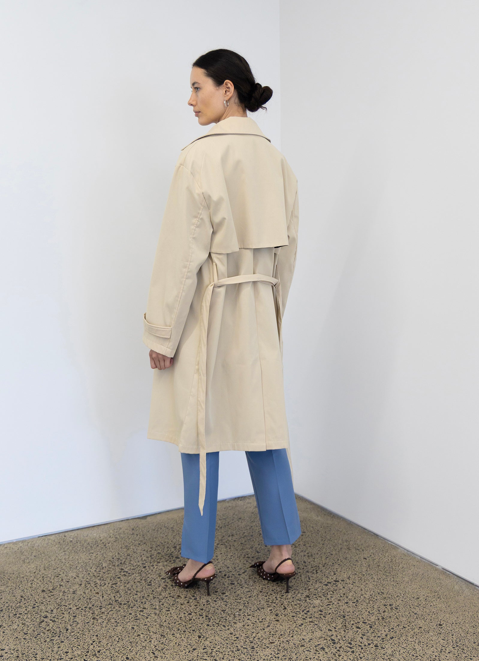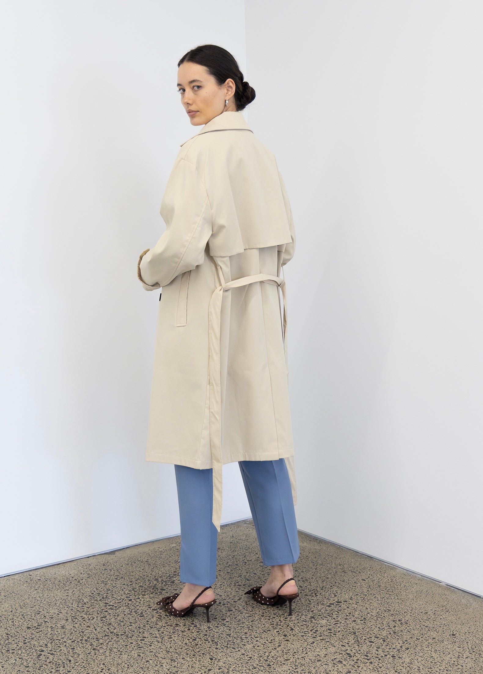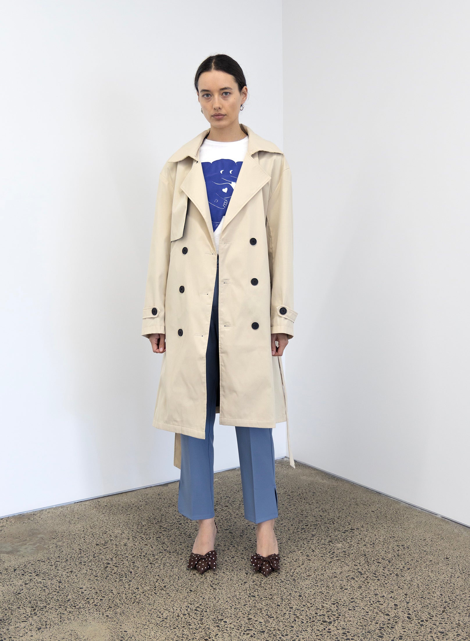 Our classic trench gets a summer make over in a light waxed cotton in cream with contasting buttons in black. Perfect for those in-bewteen seasosn balmy wet days.