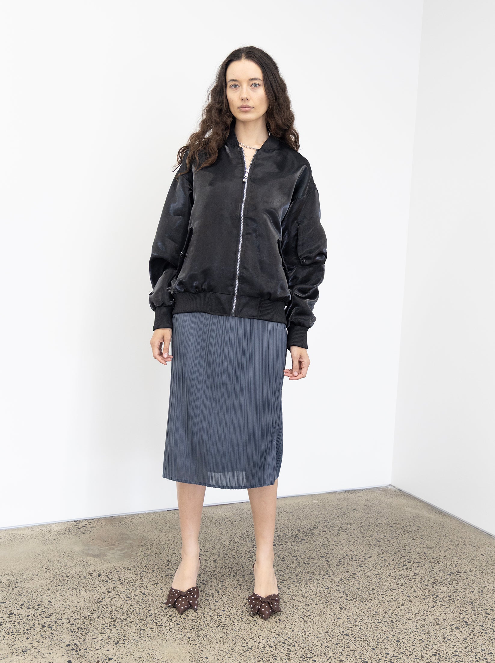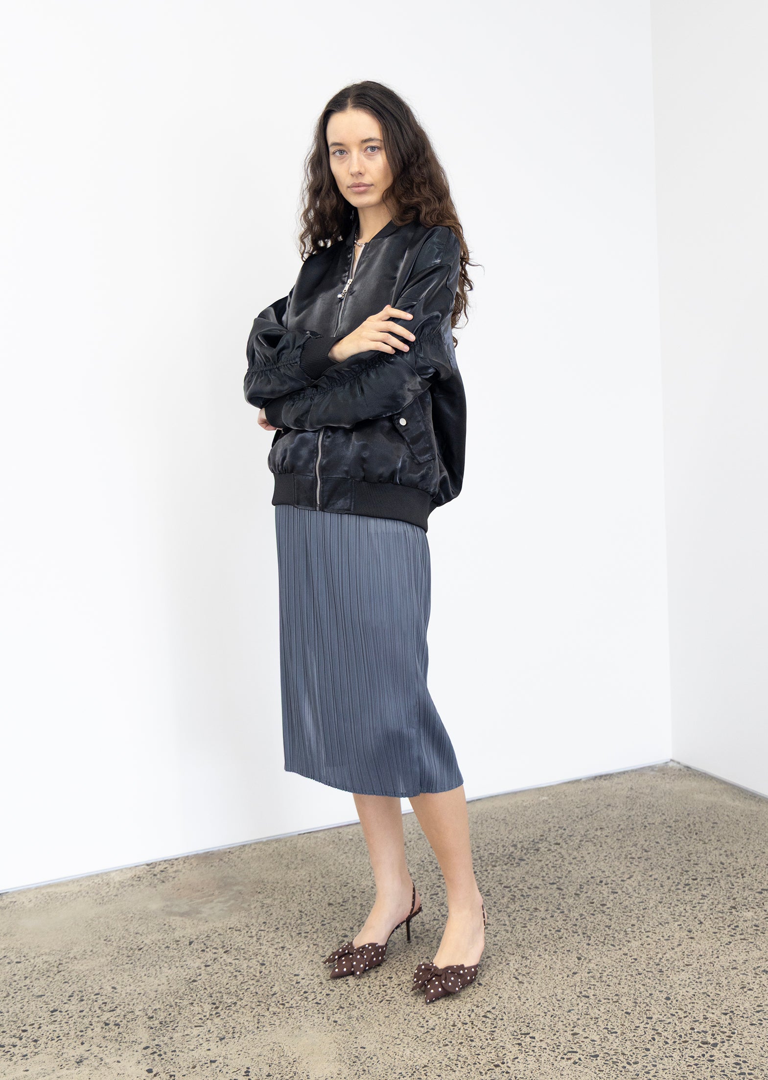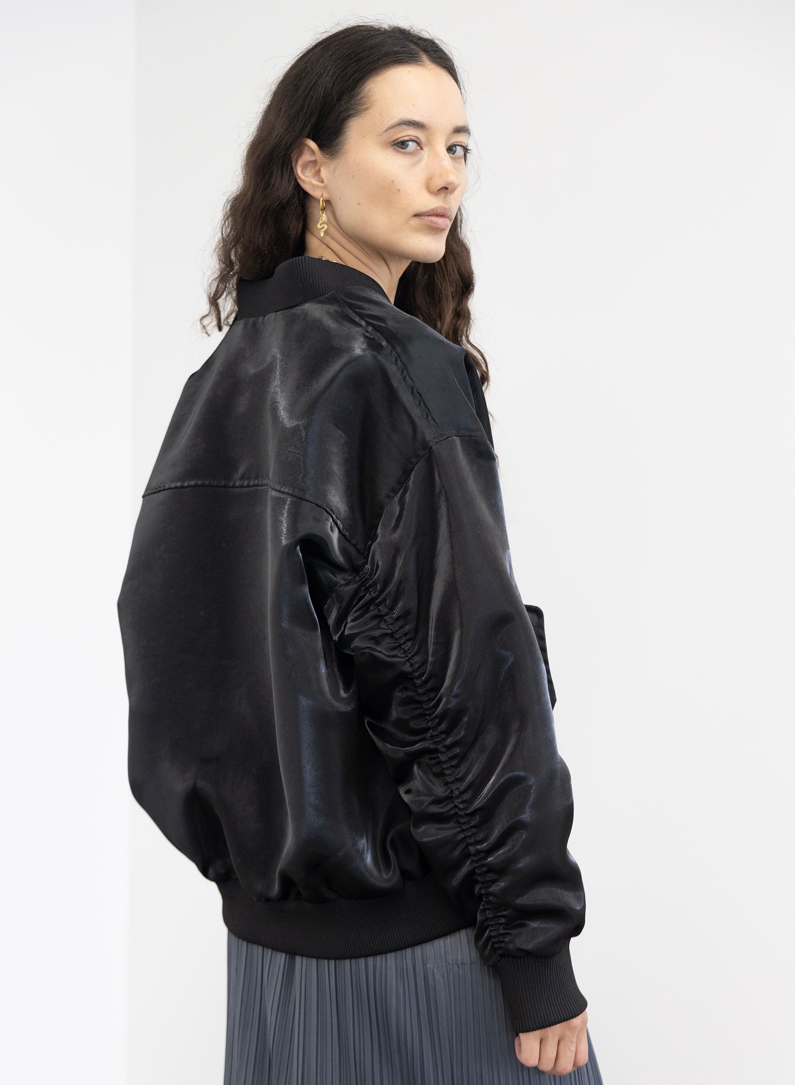 This luxe silk and nylon combined fabric make this bomber move like liquid in the night its luxury feel and fit make for a glamorous must have wardrobe staple. Fit is over sized.