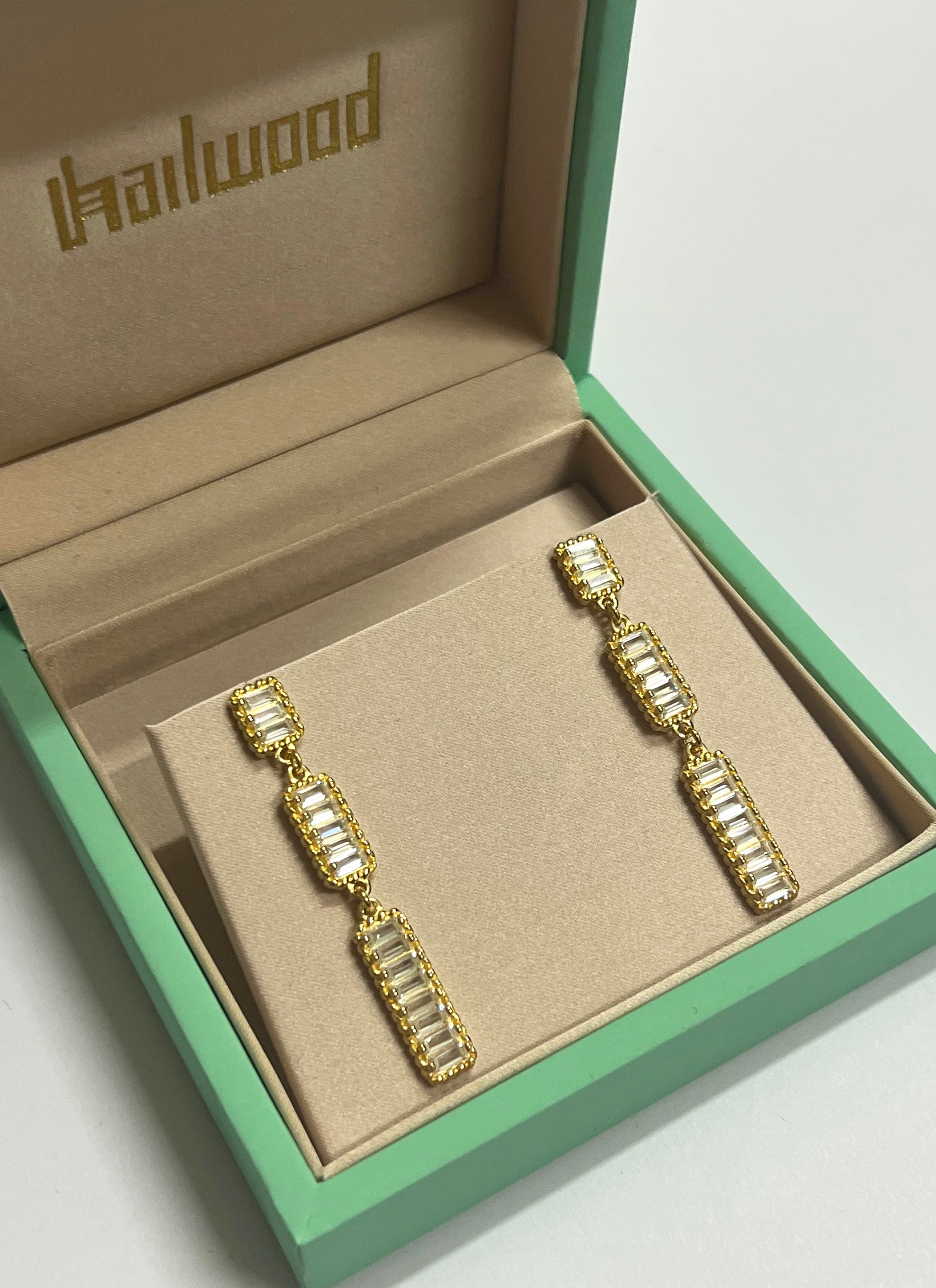 Square facet cut quartz crystals formed in three teir drops are made of Sterling Silver and 9k gold plate, they are an elegant statement earring perfect for black tie events or pair with a white shirt and denim jeans for a chic casual look.